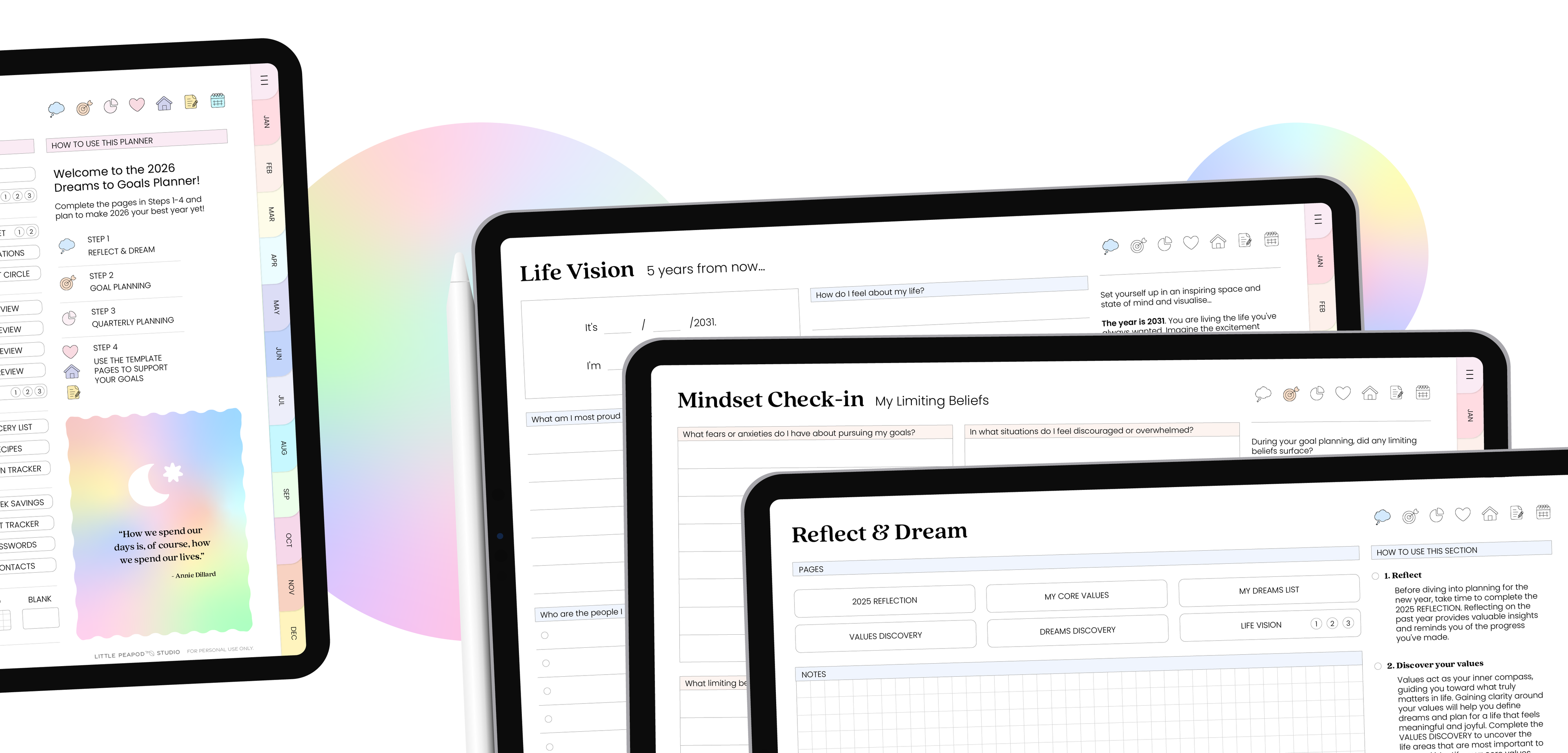 The Dreams to Goals Planner was designed to help you uncover your big dreams and turn them into smaller achievable tasks with practical goals setting and planning. With self-reflections and activities based on psychological research (such as identifying values and limiting beliefs), you can work through the mental and emotional challenges that we all face on the personal journey of reaching our potential and living a life we love.
