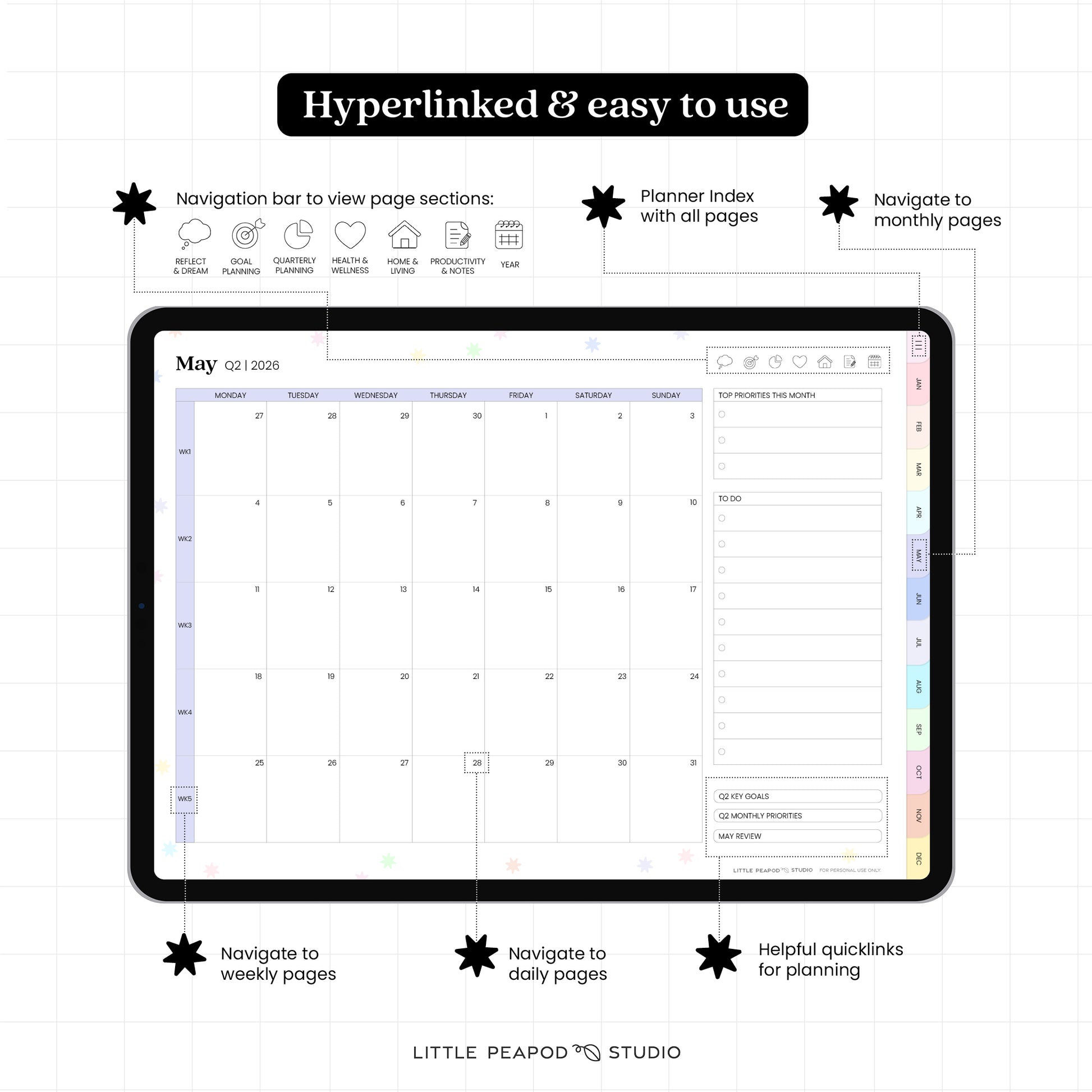 ✓ Daily, weekly, monthly, quarterly planner pages dated January 2026 to December 2026