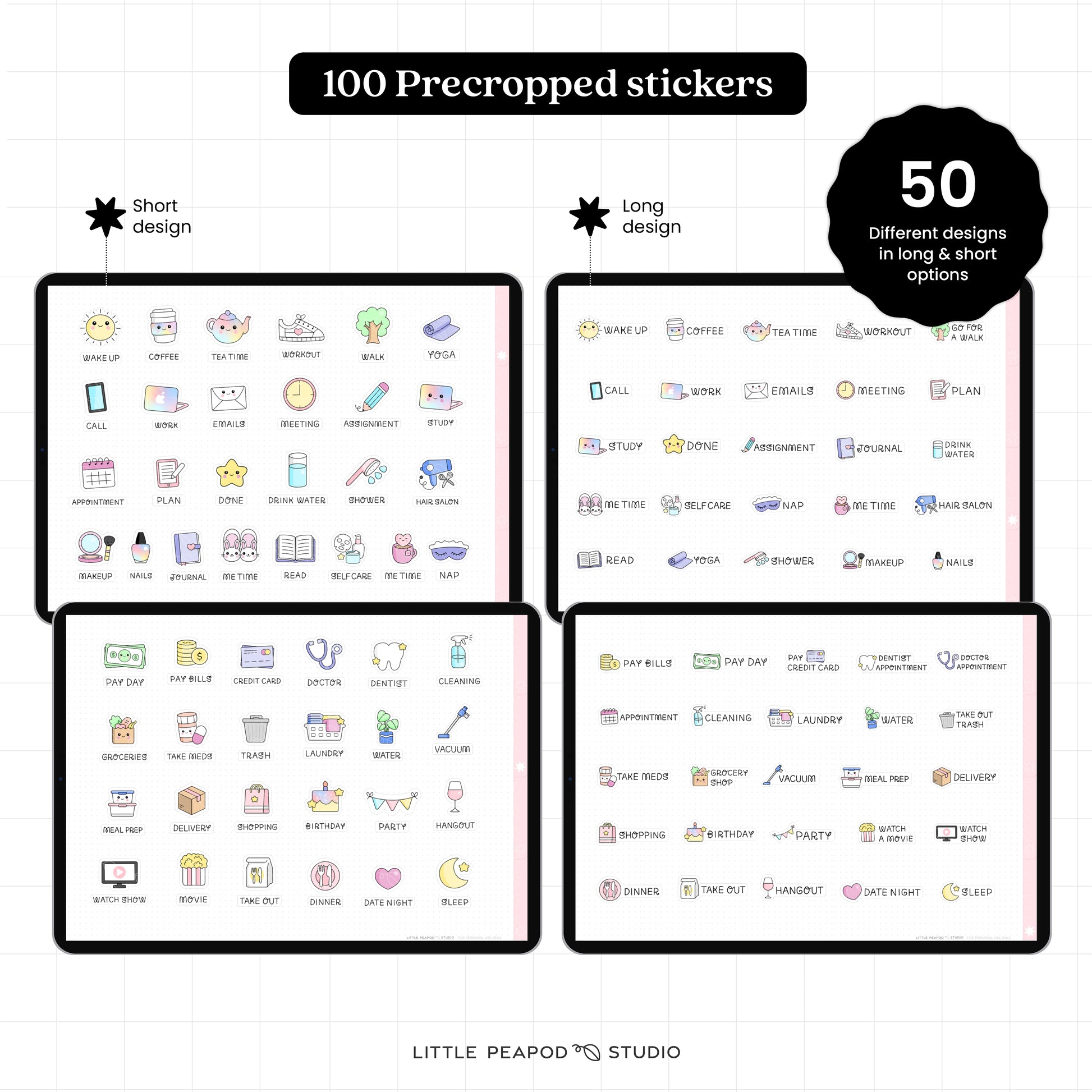 100 digital stickers pack for Goodnotes, Notability, Penly and other apps. Illustrations are hand drawn and thoughtfully organised making them perfect for everyday digital planning! Images and video show all the stickers included.